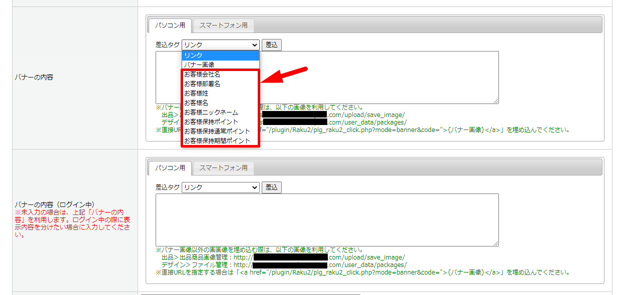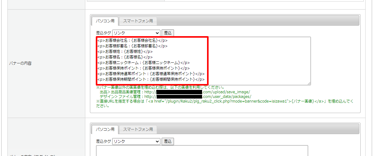 「http://ドメイン/upload/save_image/」のURLから始まる画像を利用してください。 ※直接URLを指定する場合は「<a href=”/plugin/Raku2/plg_raku2_click.php?mode=banner&code=bnr_sample”>{バナー画像}</a>」を埋め込んでください。