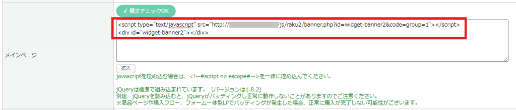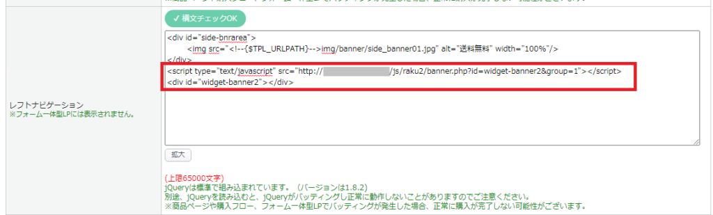 <script type="text/javascript" src="http://{店舗様のドメイン}/js/raku2/banner.php?id=widget-banner1&group=1"></script>