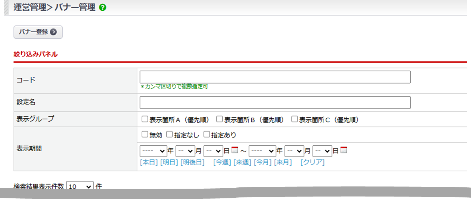 | 表示期間 | バナーを表示する期間の設定が可能です。 非表示にする場合は「無効」、期間を指定せず表示する場合は「指定なし」、 期間を指定して表示する場合は「指定あり」を選択し、 開始・終了期間を設定してください。 |