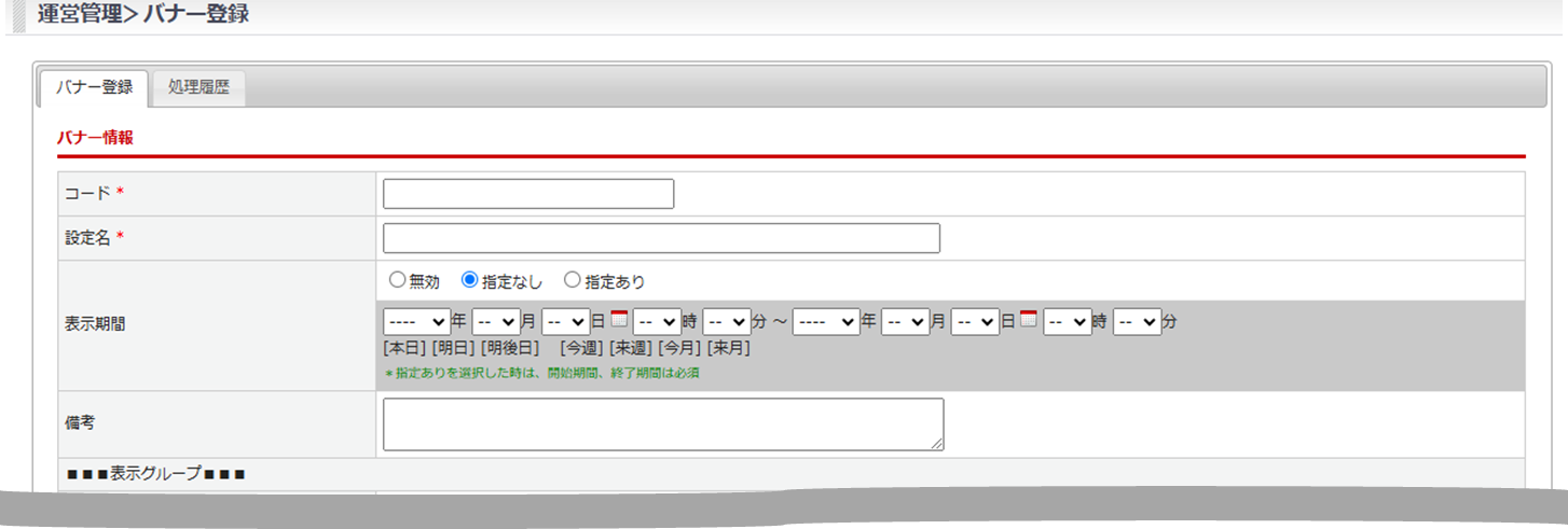 [運営>バナー管理]の上部からバナー登録をクリックすると、バナー情報登録画面に遷移します。