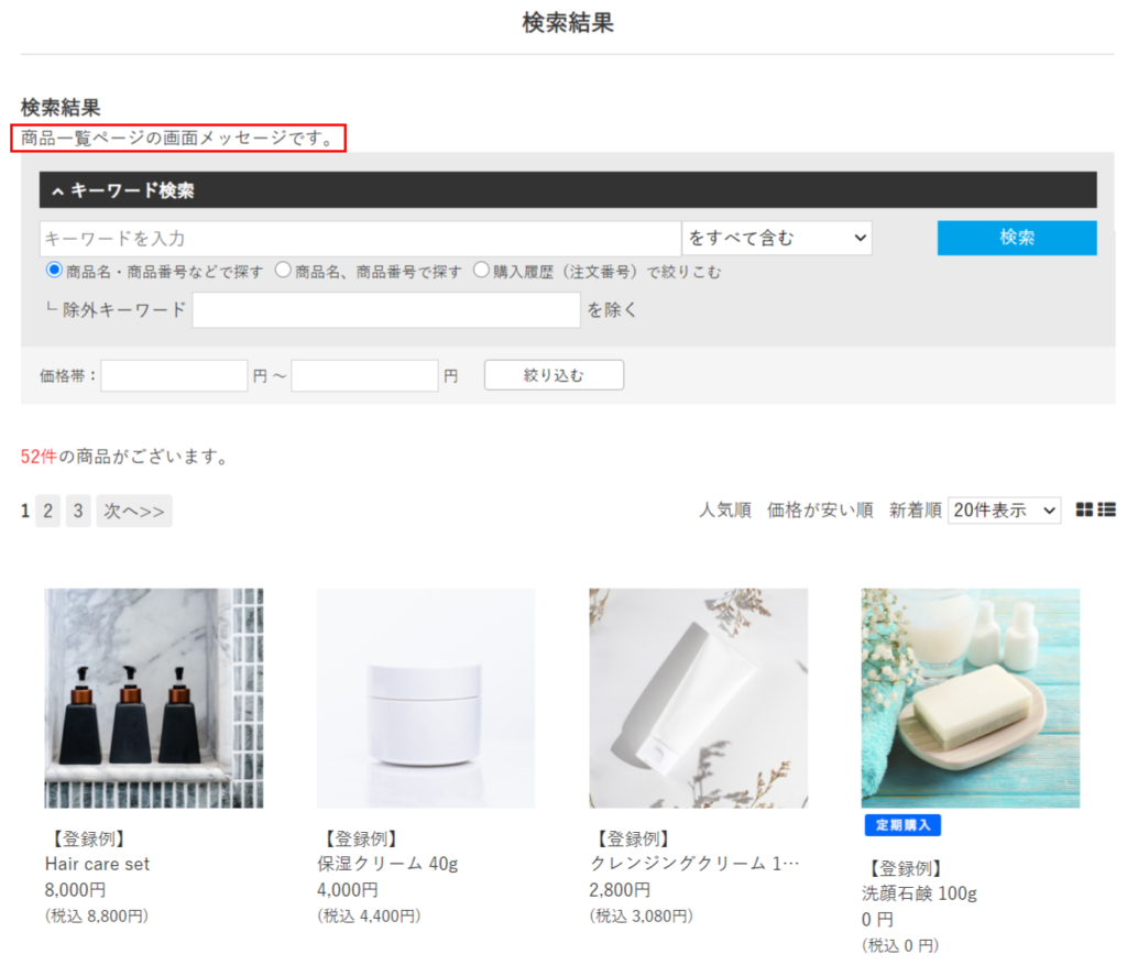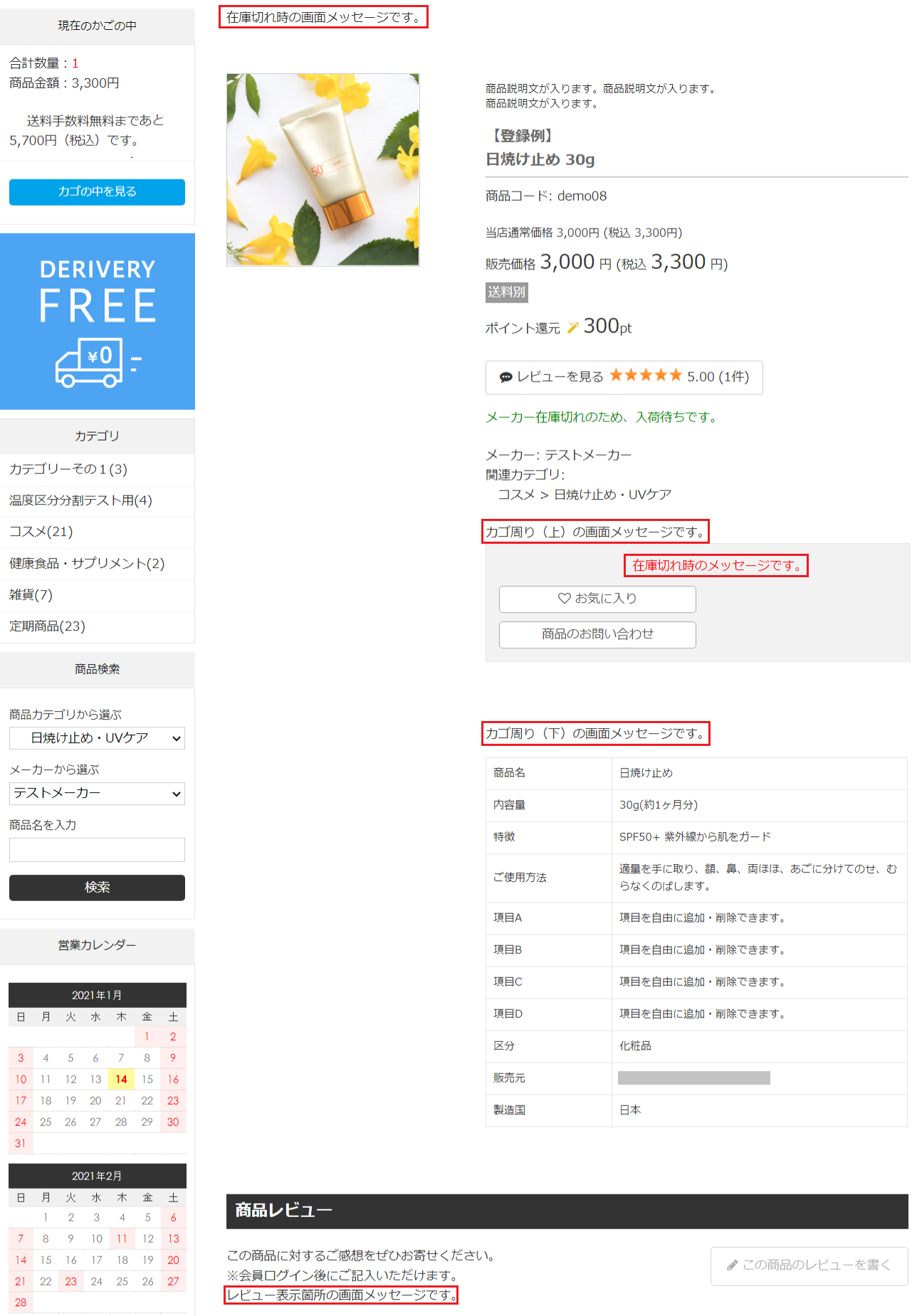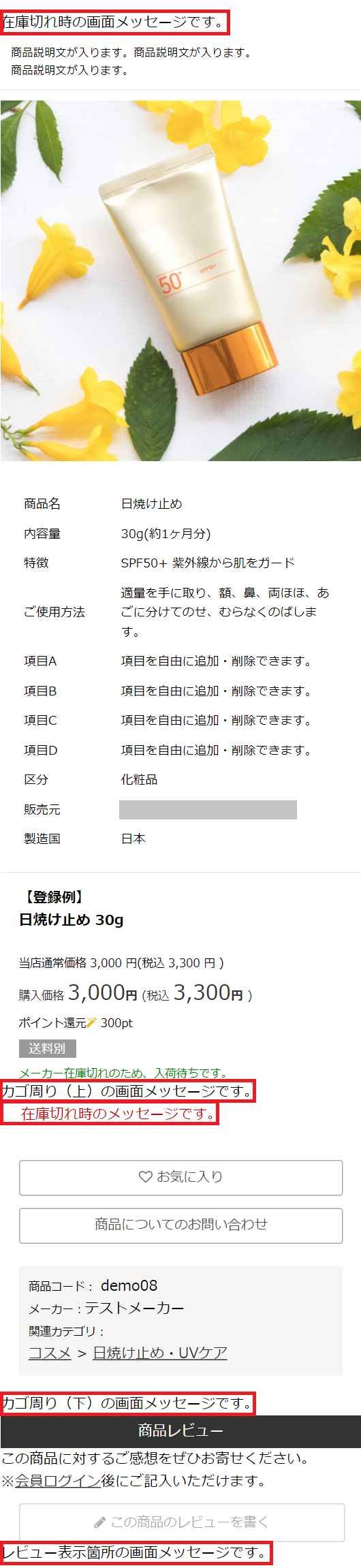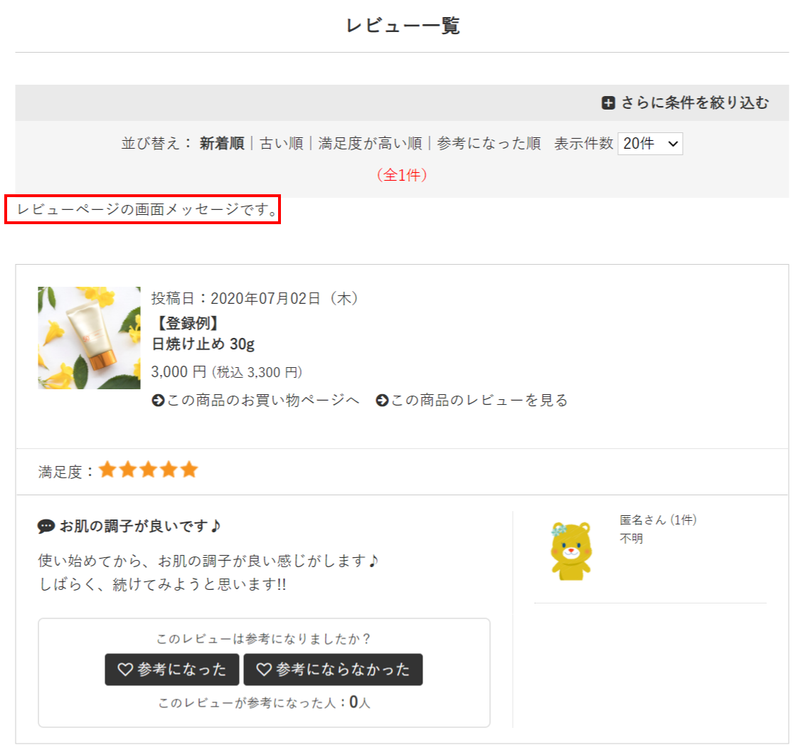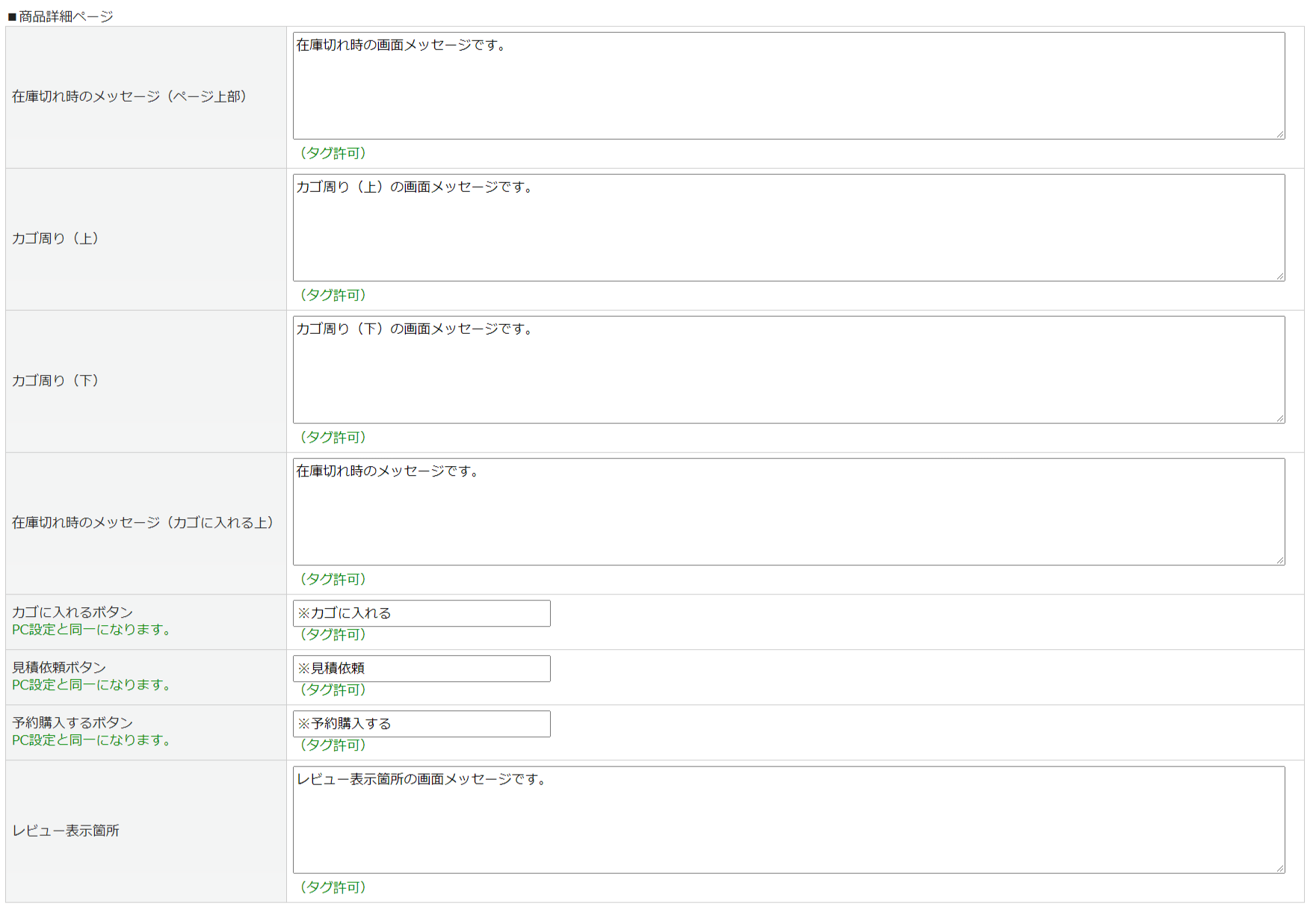 デザイン(PC/SP) > 画面メッセージ設定 > [商品詳細ページやレビューページ]タブに登録した内容が