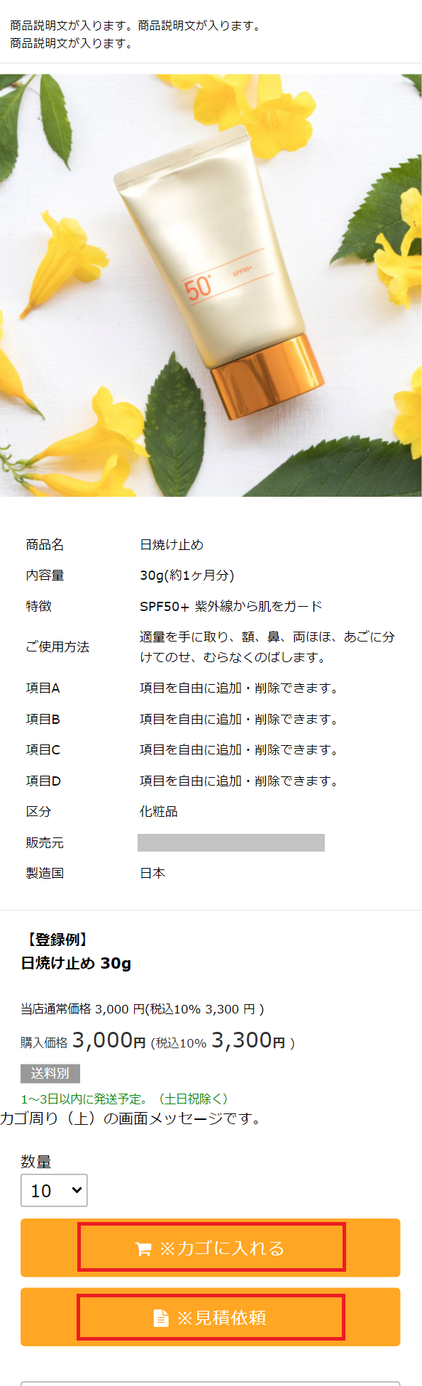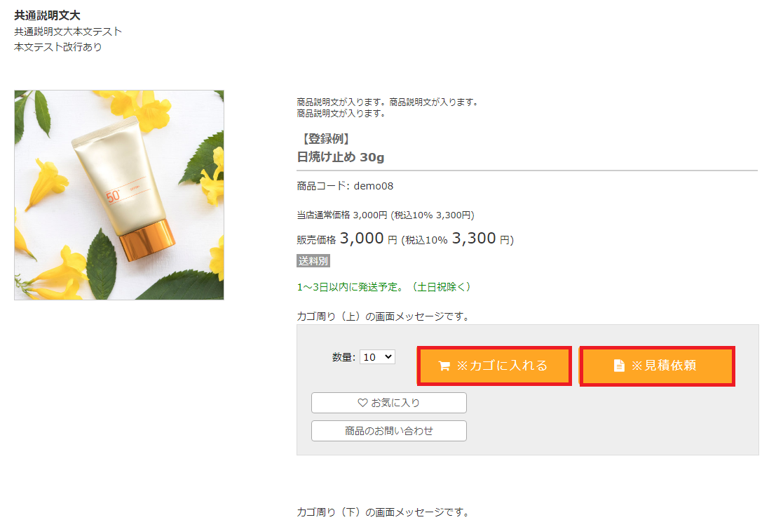 「カゴに入れるボタン」 「見積依頼ボタン」 の画面表示