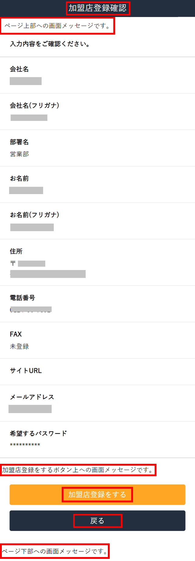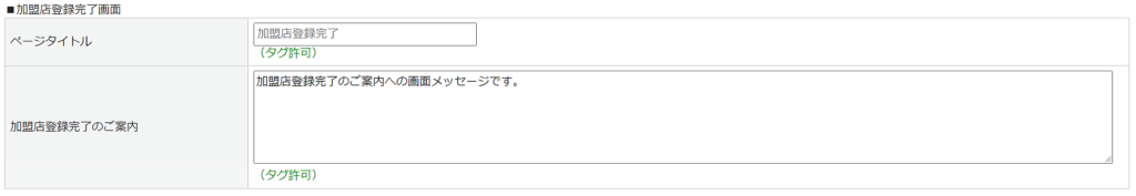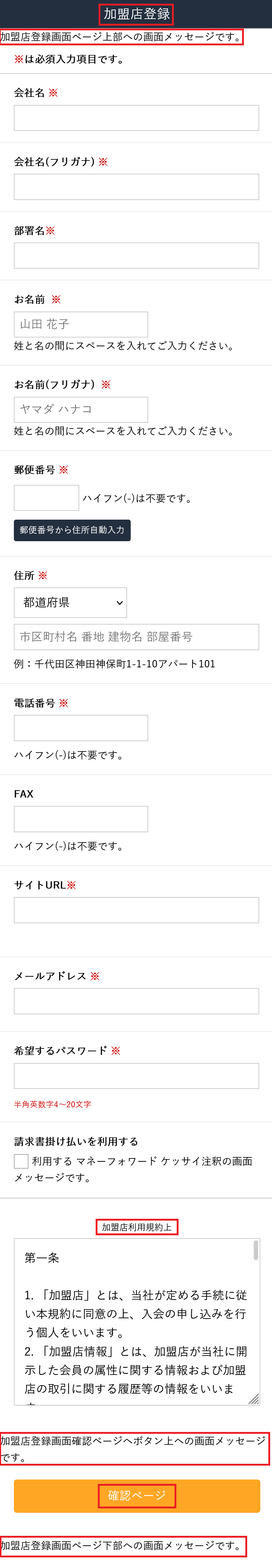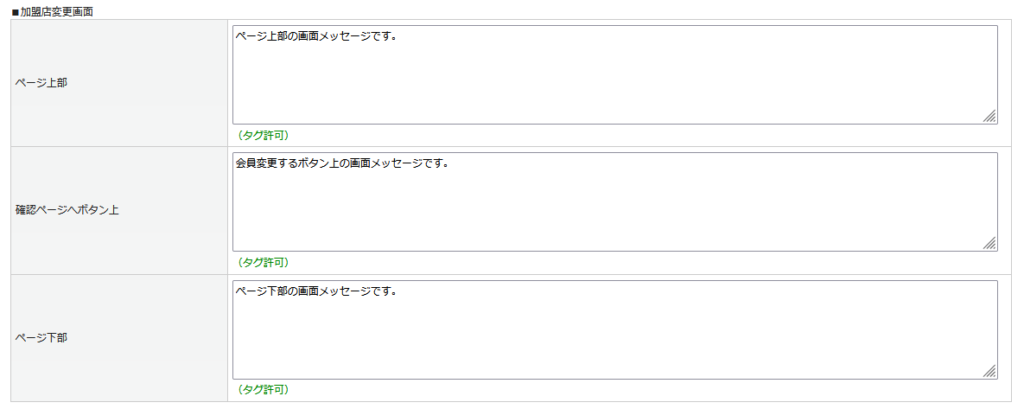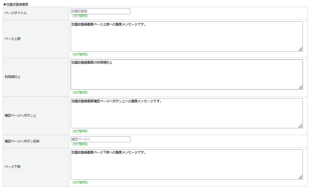 加盟店登録画面やMYページ画面内への画面メッセージ設定です。