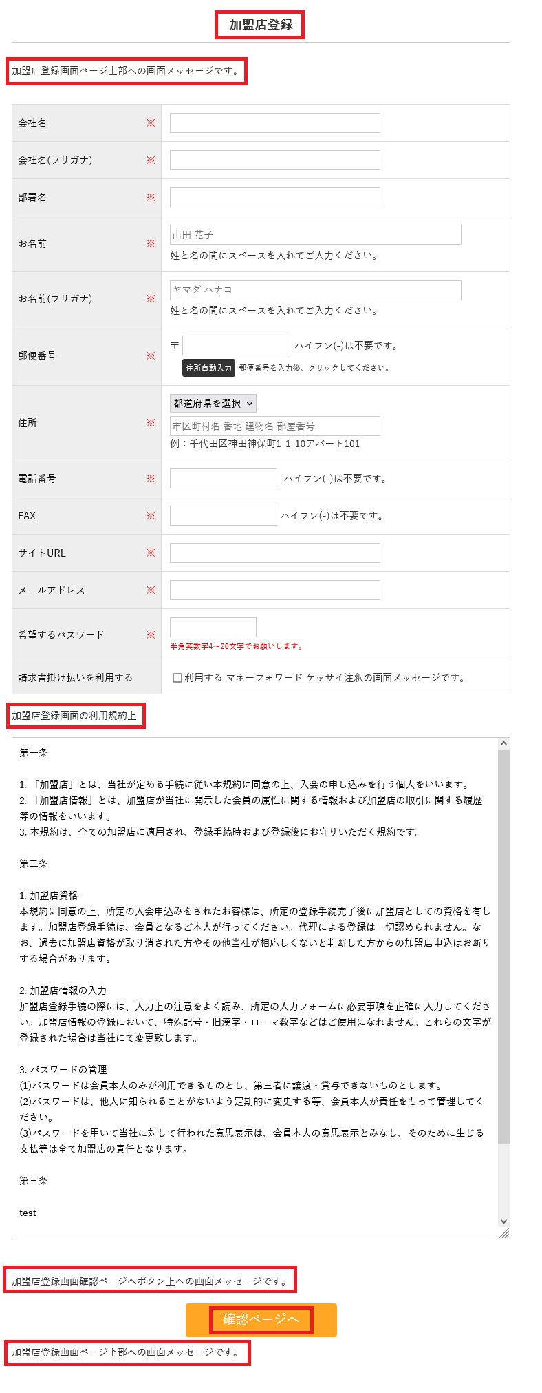 加盟店登録画面やMYページ画面内への画面メッセージ設定です。