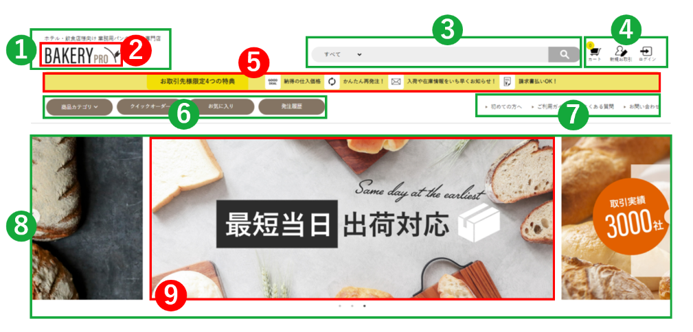 - ナビゲーション(商品カテゴリやクイックオーダー等、各種メインメニューに遷移するボタン群)