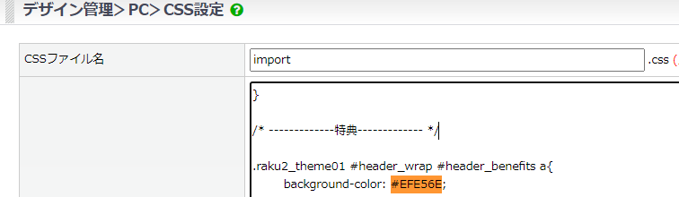 背景色②:デザイン(PC/SP) > スタイルシート設定 > 「import.css」の編集画面