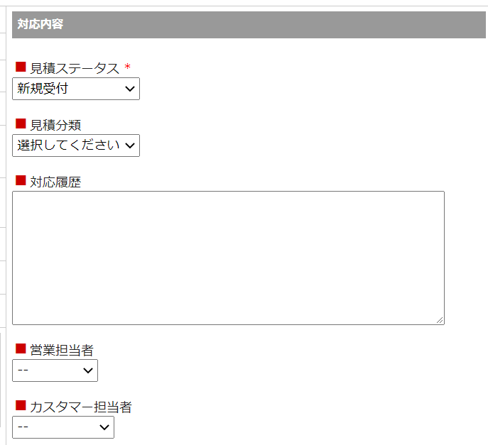 | 見積ルート* | 見積登録のルートが表示されます。 フロントからの登録時には「ネット見積」がセットされます。 管理画面からの見積登録時には任意のルートを選択いただけます。(デフォルトは「電話見積」) |