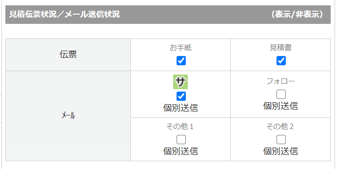 伝票(お手紙、見積書)の出力状況、メール(サンクスメール、フォローメール、その他メール)の送信状況を確認いただけます。