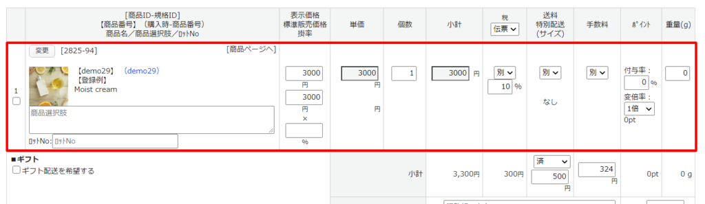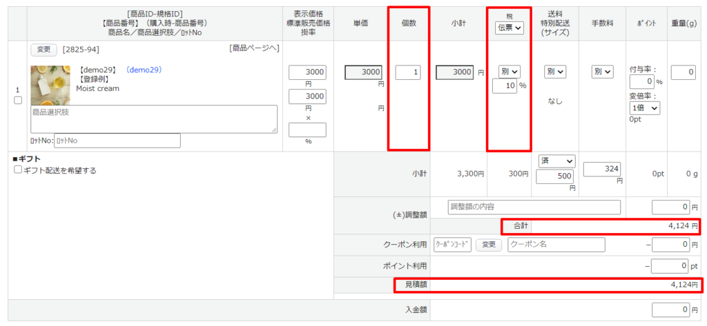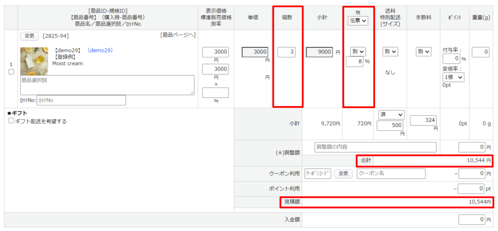 商品追加後に、「個数」や「税」等の変更が可能です。