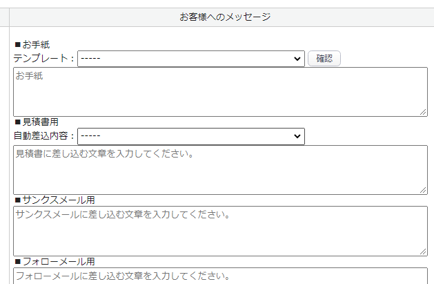 またテキストボックスでは、お手紙や納品書、各メールに差し込む文章を設定できます。