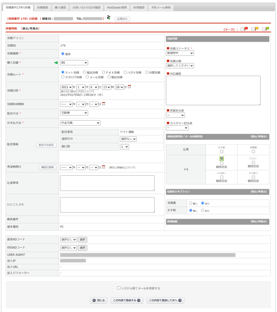 | USER AGENT | 見積登録時のユーザーエージェントが表示されます。 |