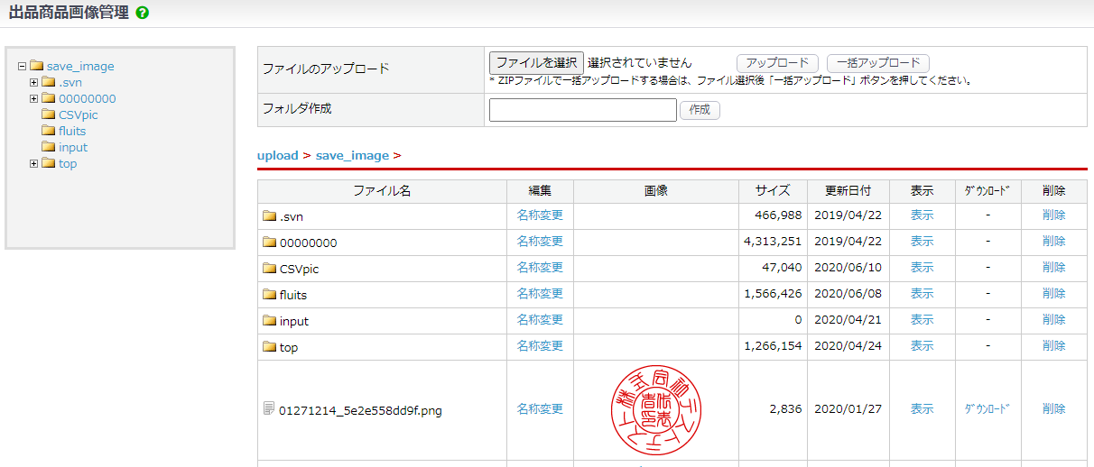 また、出品 > 出品商品登録 でアップロードした画像ファイルの管理を行えます。