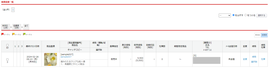 送信後は、再入荷管理の「メール送信日時」とMYページの「再入荷日」にメール送信日時が反映されます。
