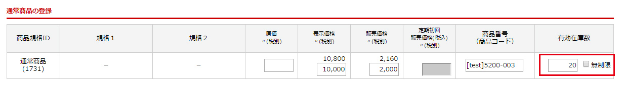 有効在庫数に在庫数を設定し、登録してください。