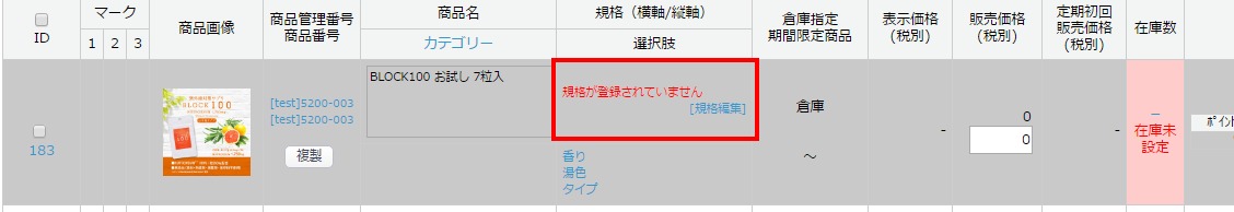 出品商品一覧にて該当商品の[規格編集]をクリックし項目選択肢登録(規格登録)画面へ遷移して下さい。