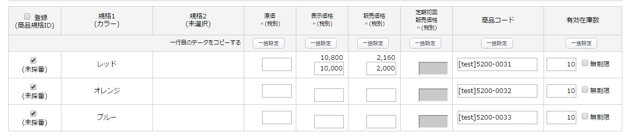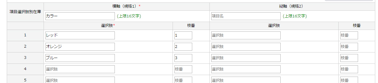 サイズや色等の規格を登録して下さい。(2軸まで設定可能です)