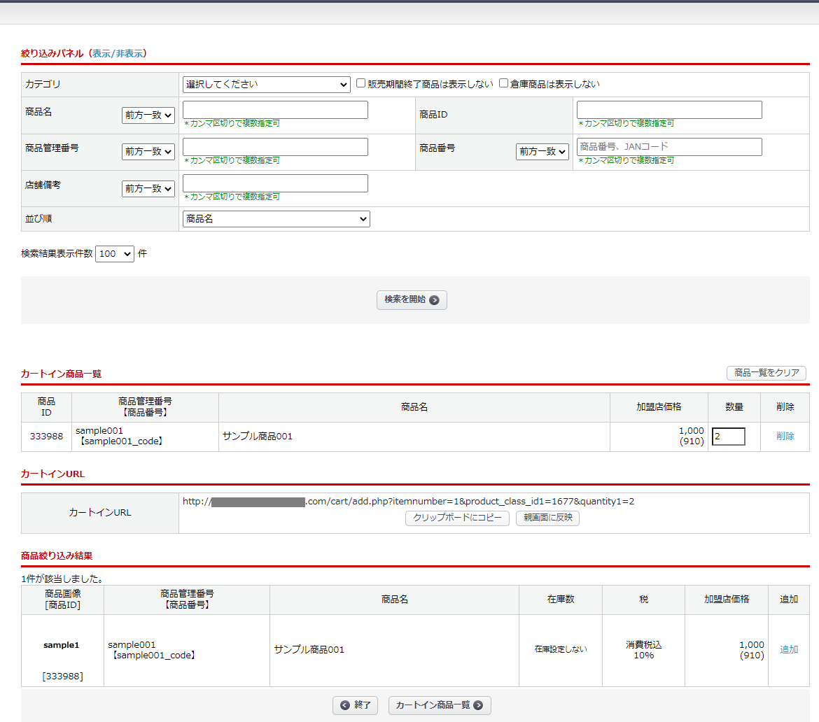 • カートインURL生成画面