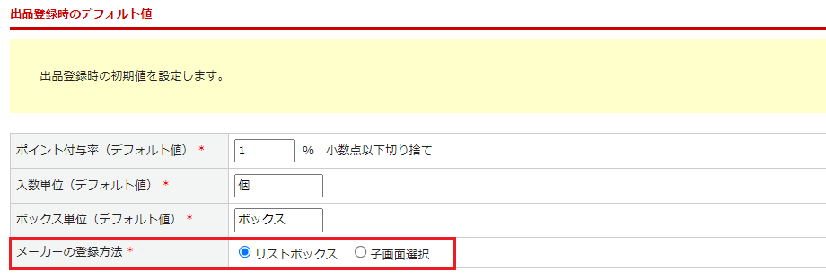 基本設定 > カートシステム設定 > [出品機能設定]タブより、「メーカーの登録方法」を変更します。