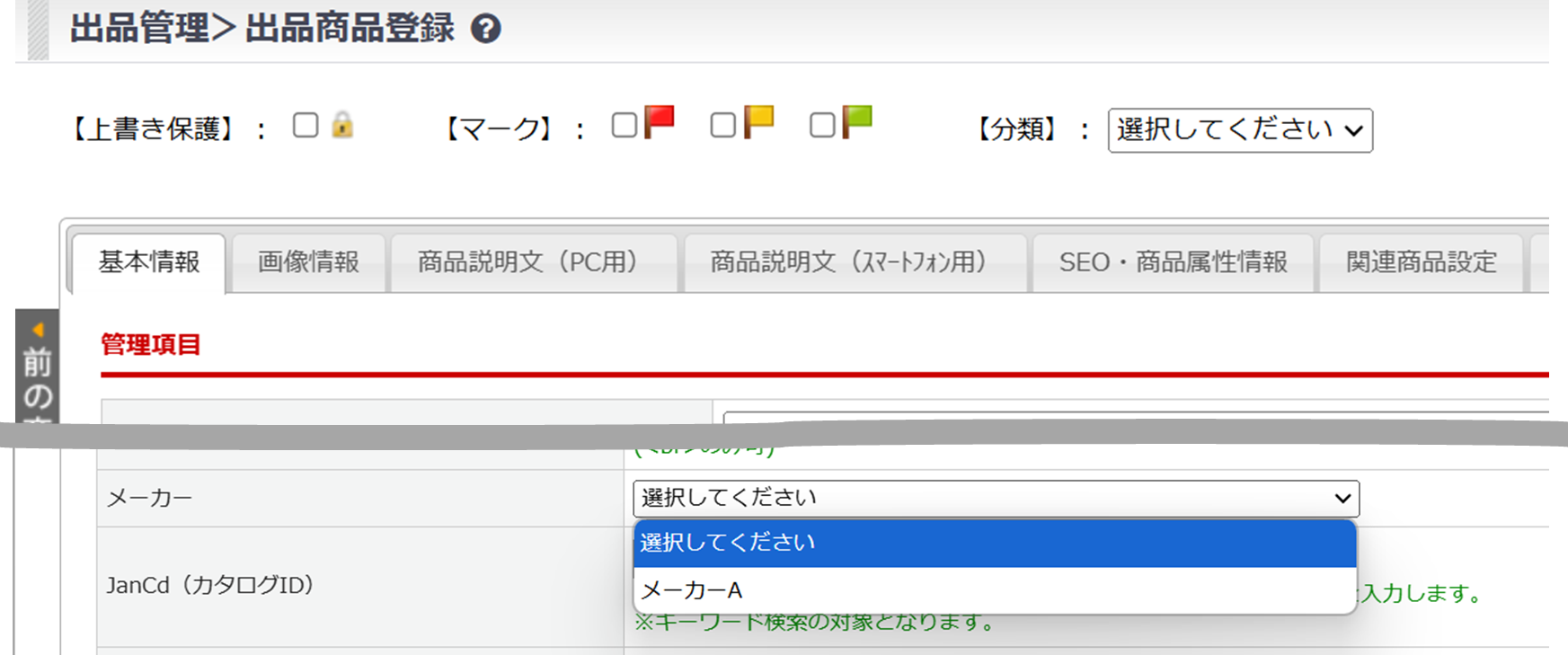 出品 > 出品商品登録 >[基本情報]タブから、メーカーの選択が可能となります。