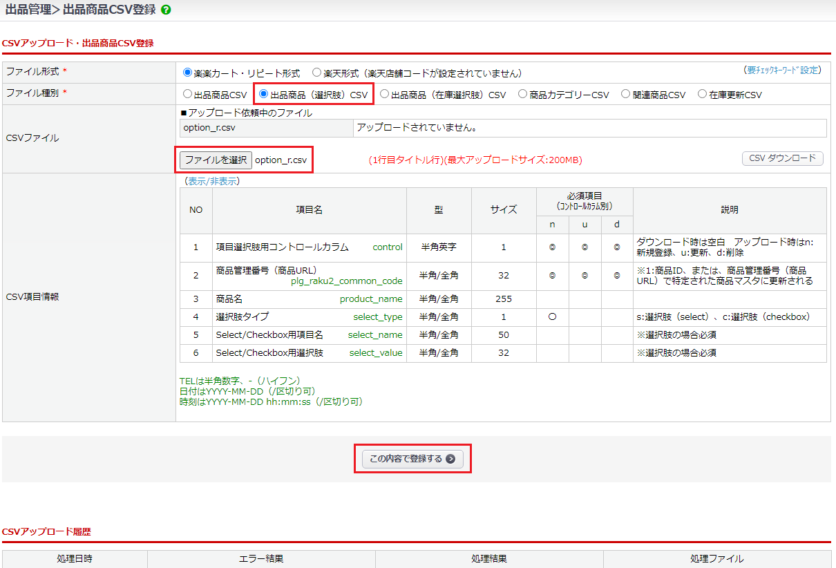 出品>出品商品CSV登録 にて、「出品商品(選択肢)CSV」のアップロードが可能です。