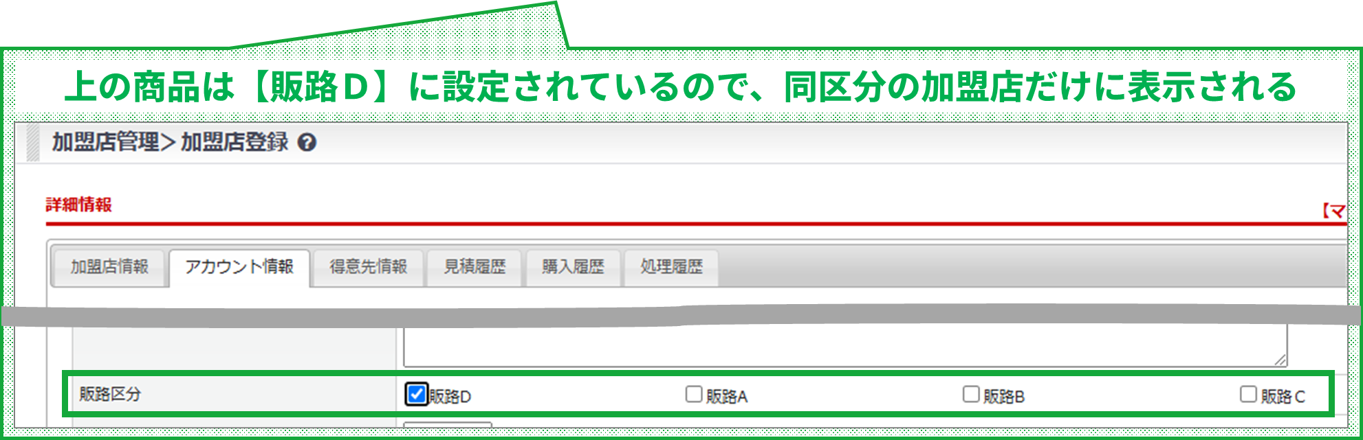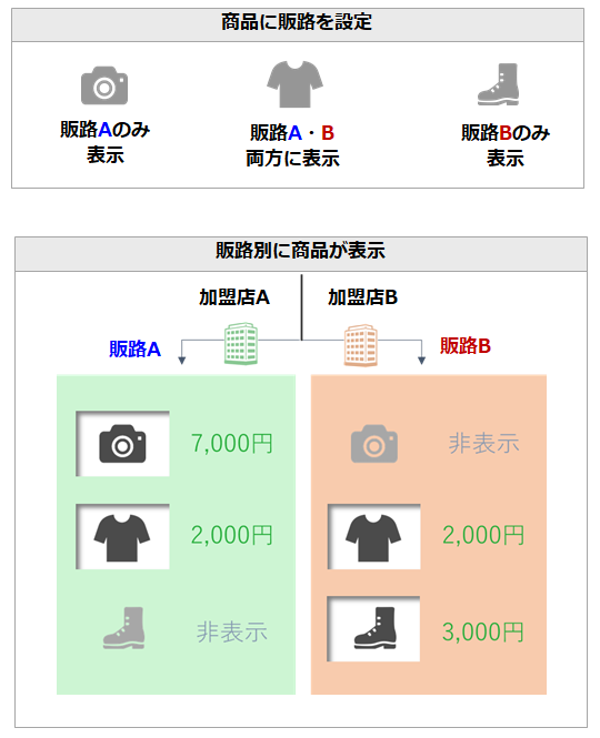 ・靴:販路Bのみ表示設定 → 販路Bの加盟店のみに表示、販路Aの加盟店では非表示