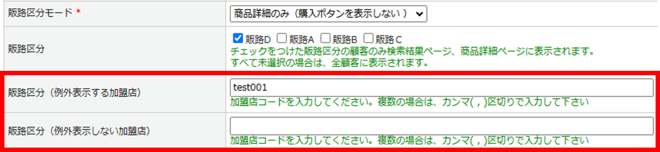 例外的に表示する加盟店の加盟店コードを入力してください。複数の場合は、カンマ( , )区切りで入力してください。