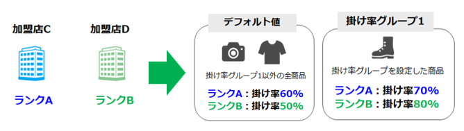 - 加盟店Cが「掛け率グループ1」に属する商品を購入 ⇒ 掛け率70%
