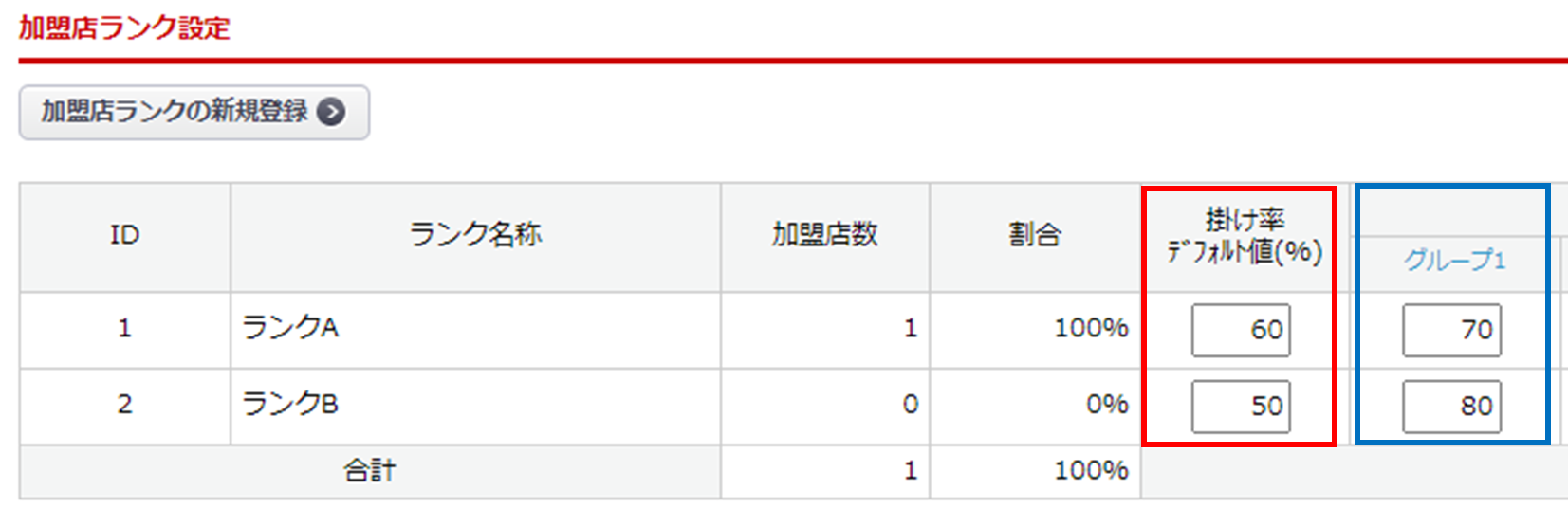 加盟店 > 加盟店ランク管理 から、対象加盟店ランクに掛け率グループを設定します。