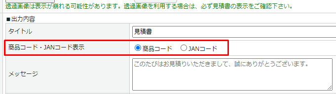 「納品書」と「見積書」の出力内容設定から、伝票出力時に商品コード/JANコードのどちらを表示するか選択できます。