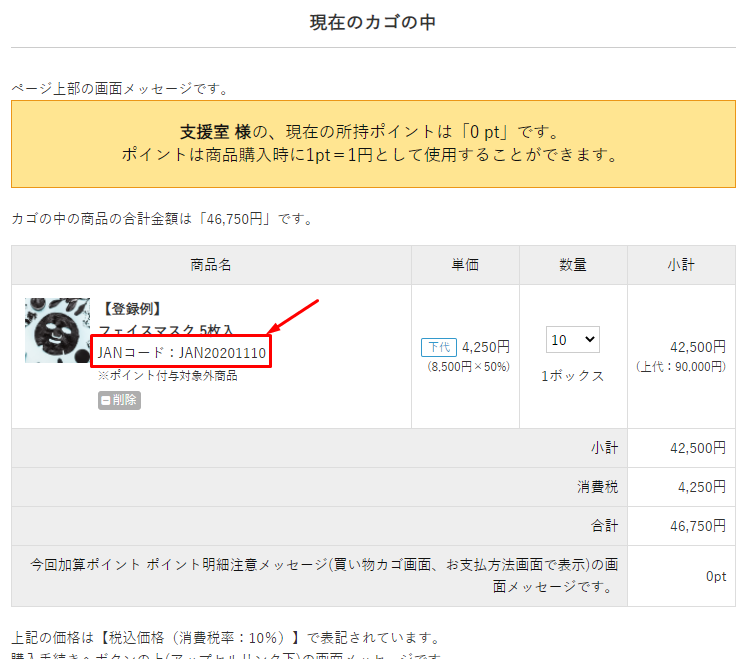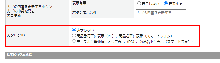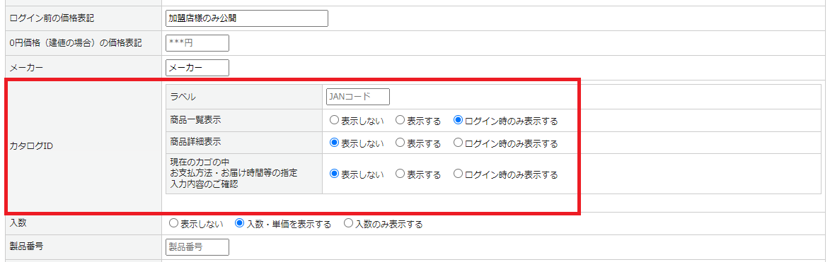 項目表記」では商品詳細ページ、買い物カゴ、お支払方法・お届け時間等の指定、入力内容のご確認画面でのJANコード表示有無について設定できます。