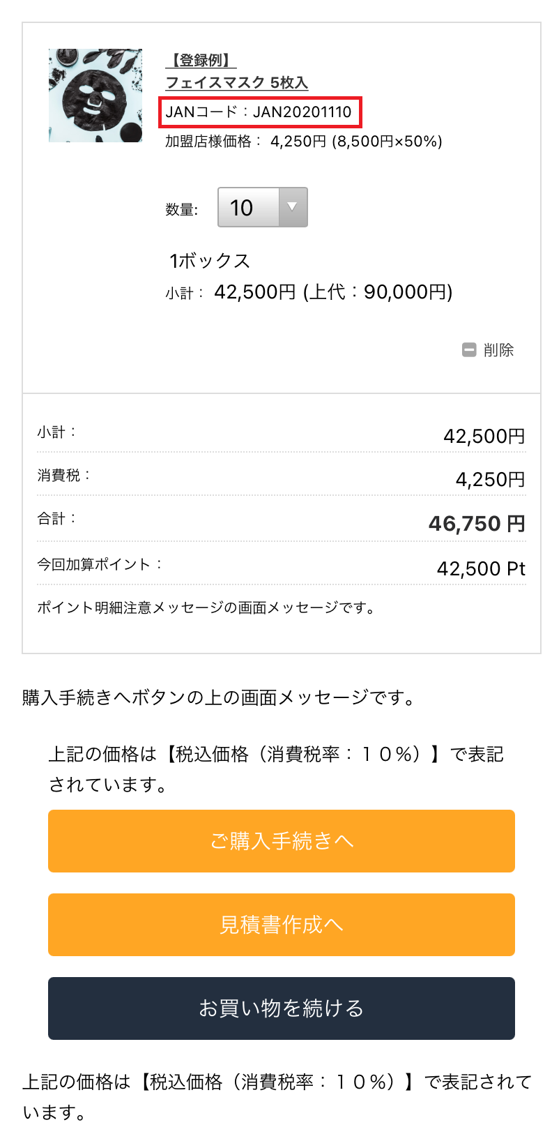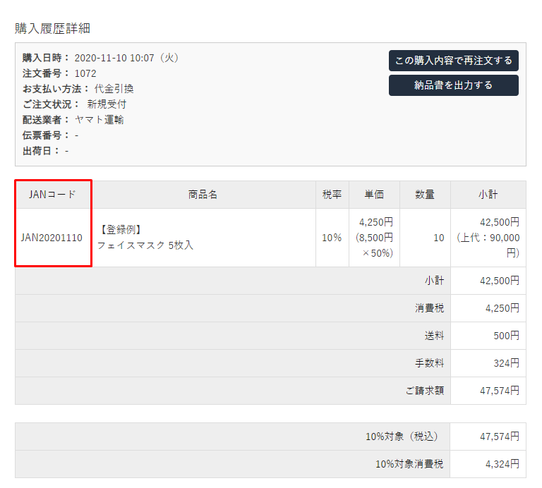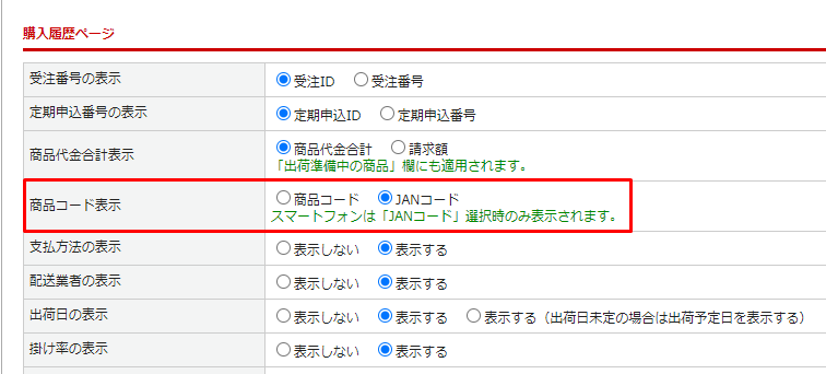 購入履歴詳細ページ」で、MYページの購入履歴詳細、見積履歴詳細画面での商品コード/JANコードのどちらを表示するか選択できます。