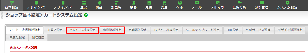 商品詳細、買い物カゴ~入力内容のご確認画面・・・「出品機能設定」タブ