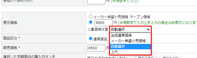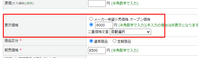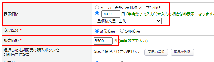 二重価格表示を行うにあたり、「表示価格」と「販売価格」を設定します。