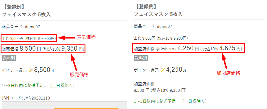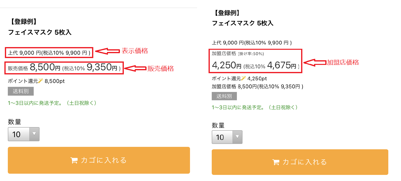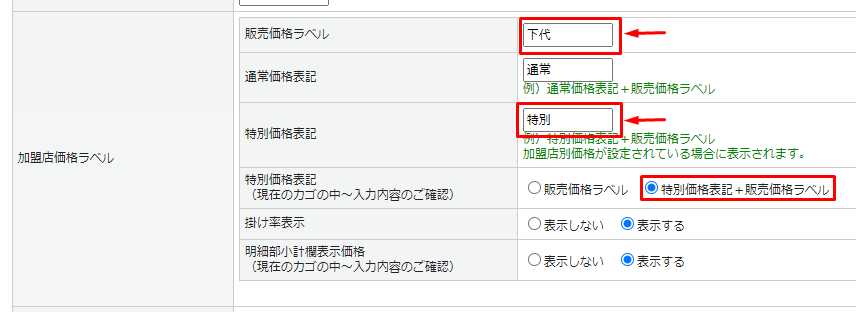※販売価格と加盟店価格の文言は、カートシステム設定>出品機能設定タブ から設定できます。