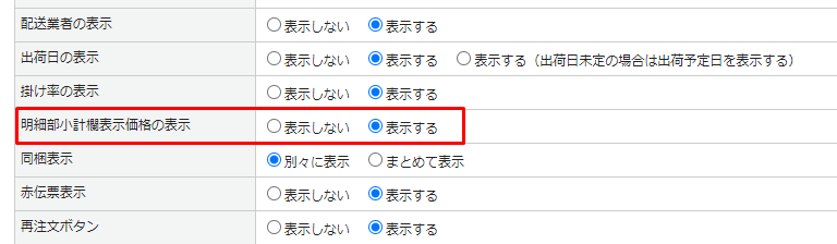 「購入履歴ページ」の設定から、MYページの購入履歴詳細画面で、明細部小計欄表示価格の表示有無を設定できます。