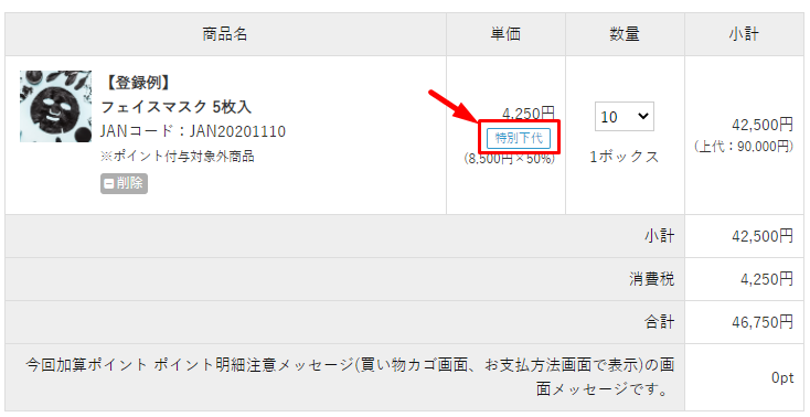 出品機能設定タブの「特別価格表記(現在のカゴの中~入力内容のご確認)」で、”特別価格表記+販売価格ラベル”を選択した場合、販売価格ラベルと特別価格表記で設定した値を合わせた文言を、特別価格の表記として表示させます。