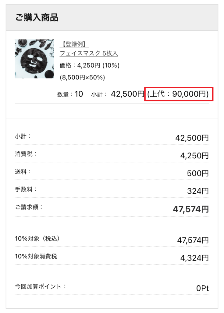 ”表示する”を選択した場合、各購入フロー画面の小計欄に表示価格と二重価格文言が表示されます。