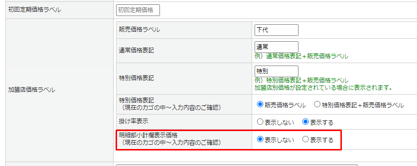 「項目表記」の設定から、買い物カゴ~入力内容のご確認画面での明細部小計欄表示価格の表示有無を設定できます。初期値は”表示しない”です。