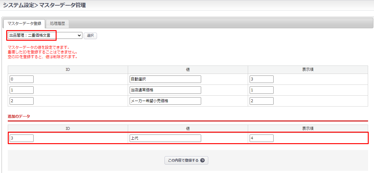 システム設定>マスターデータ管理 の「出品管理:二重価格文言」から二重価格文言の追加・編集が可能です。