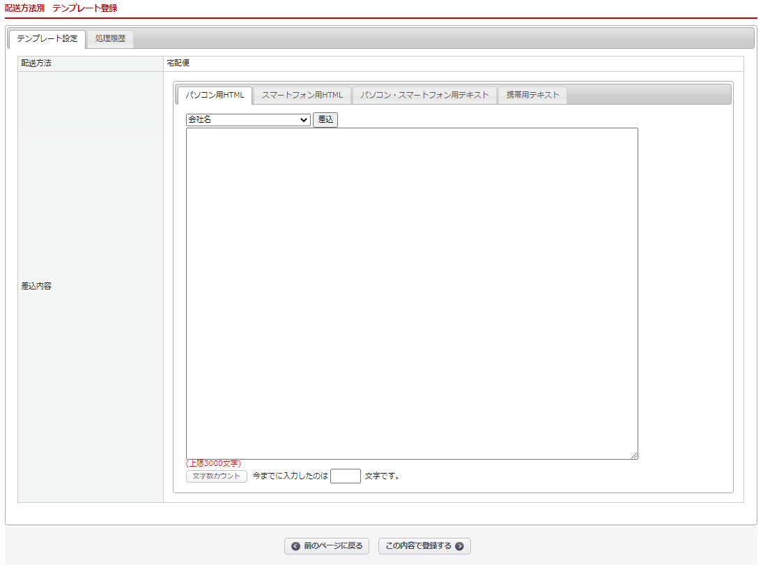 各配送方法の「編集」リンクをクリックし、差込内容を登録してください。