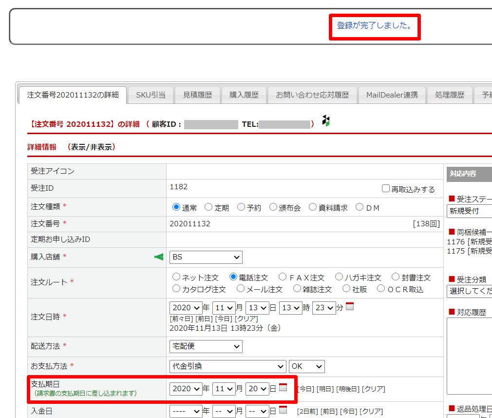 受注作成のタイミングで支払期日を設定していた支払方法を選択した場合、支払期日が自動設定されます。