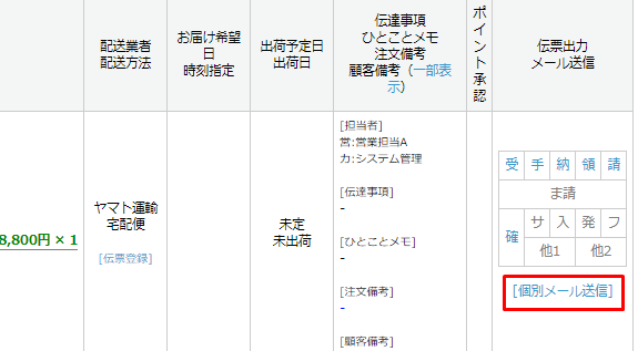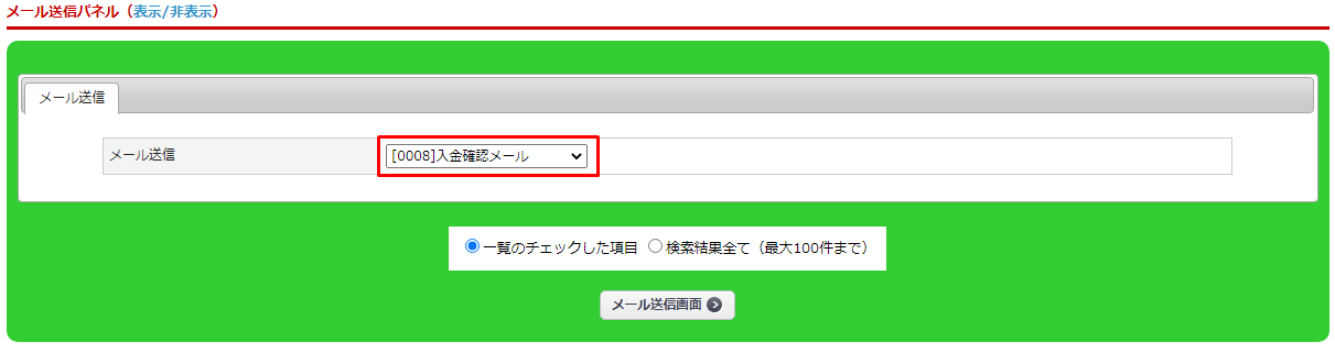 ”入金確認”メールは、受注>受注一覧 の[個別メール送信]、または、メール送信パネルから送信することができます。