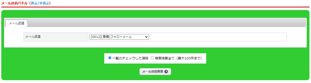 ”(見積)フォローメール”は、見積>見積一覧 の[個別メール送信]、または、メール送信パネルから送信することができます。