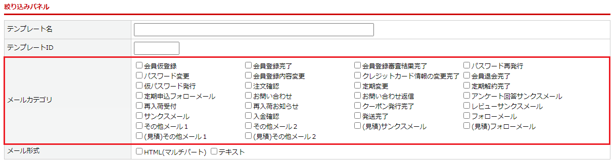 メールカテゴリを設定することで用途に合ったテンプレートを予め絞り込んだ状態で、各設定画面から選択することが可能となります。