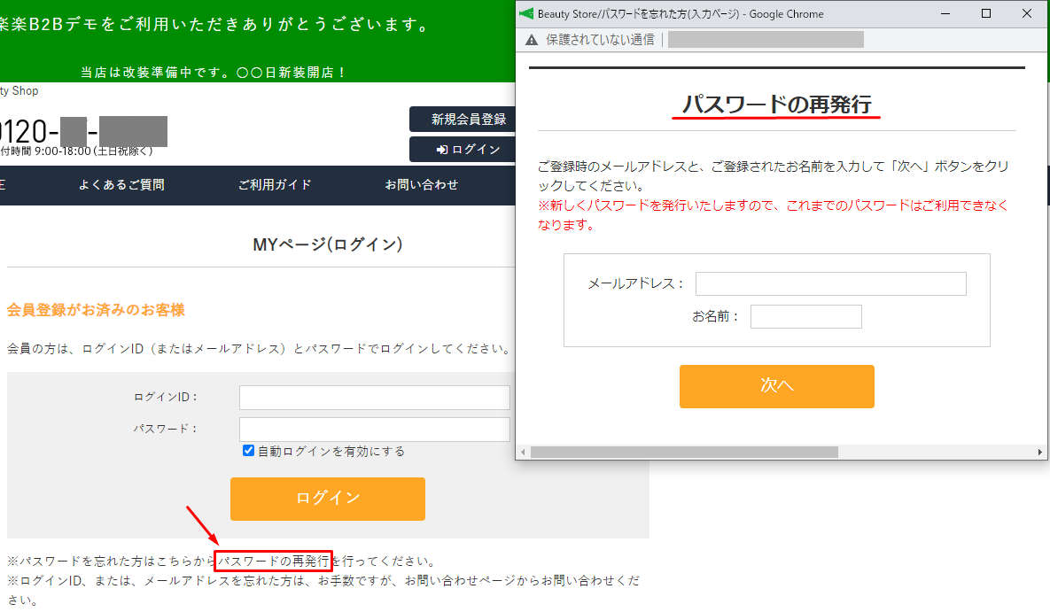 フロントのログイン画面でパスワードの再発行を行った際に送信するメールです。