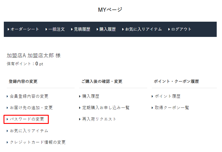 カートシステム設定>メールテンプレート設定 で、パスワード変更した際に送信するメールテンプレートを設定することで、メールが自動送信されます。