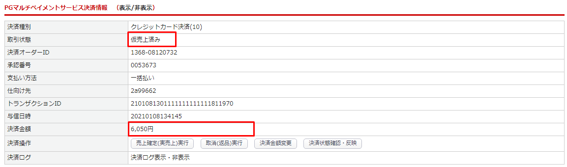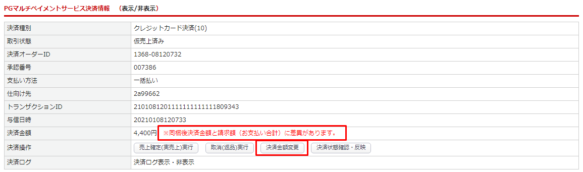 決済操作より「決済金額変更」ボタンを押下→完了すると決済金額に変更後の金額が反映され、注意表記が消えます