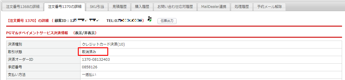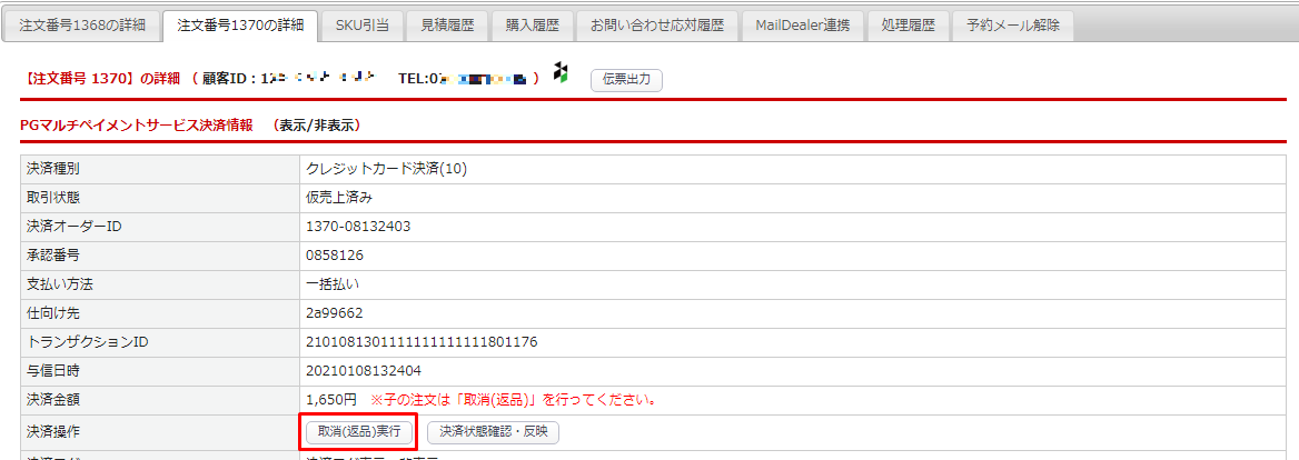 タブで子注文を開き、決済操作より「取消(返品)実行」ボタンを押下→完了すると取引状態が「取消済み」となります。