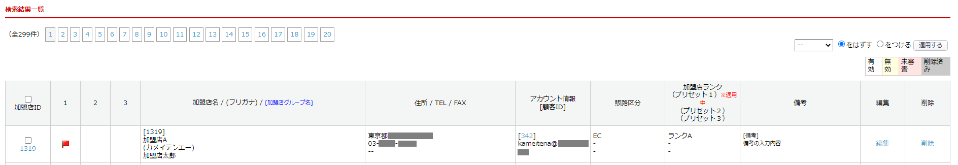 | 削除 | クリックすることで加盟店を削除します。 ※紐づく加盟店が存在する場合は削除できません |