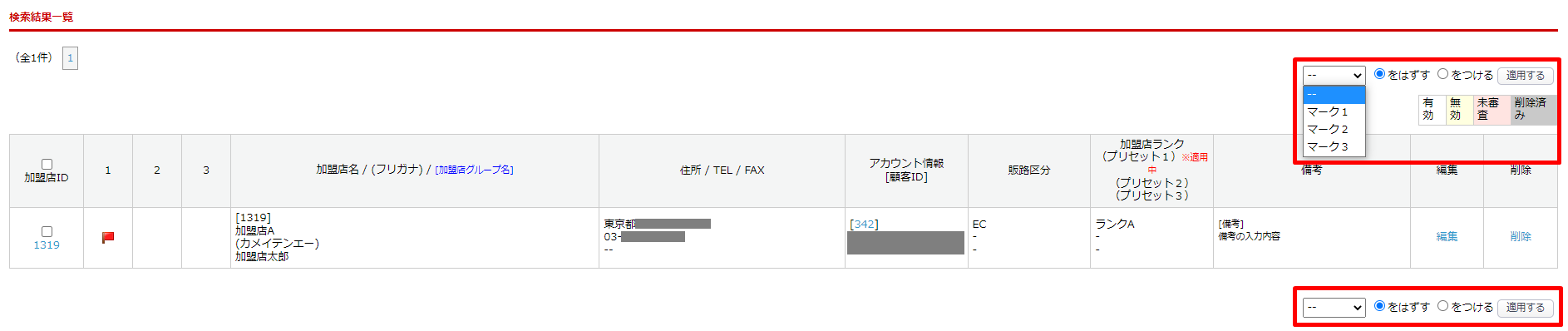 | マーク | 加盟店グループに設定されたマークを条件に検索します。 プルダウンより詳細な検索条件を設定できます。 ![]() |